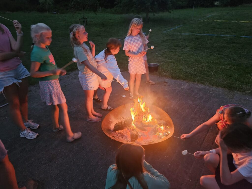 Na een dag vol zand en volleybal konden de kinderen die wilden blijven slapen op ons gezellige kamp, en dat was echt een belevenis! We sliepen in twee grote tenten in een bosrijke, rustige omgeving bij Anna’s Hoeve in Epe. ’s Avonds staken we een kampvuur aan, waar we marshmallows roosterden terwijl er spelletjes werden gespeeld.